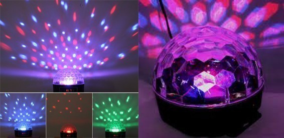 ДИСКО-ШАР LED Magic Ball Light оснащен шестью светодиодами - синий, зеленый, красный, оранжевый, белый, розовый. Светодиоды располагаются под граненым куполом шара, на вращающейся платформе и создают красочную картинку в ритм музыки. МР3 проигрыватель располагается внутри конструкции, с выводом USB порта и разъема для flash micro sd. В комплект входит флеш-карта USB на 124 mb и пульт дистанционного управления. Управление светодиодным диско-шаром LED осуществляется как на самом шаре, так и на пульте. Функции: переключение треков вперед-назад, перемотка трека вперед-назад, переключение в стационарный режим. Диско-шар оснащен двумя встроенными колонками.